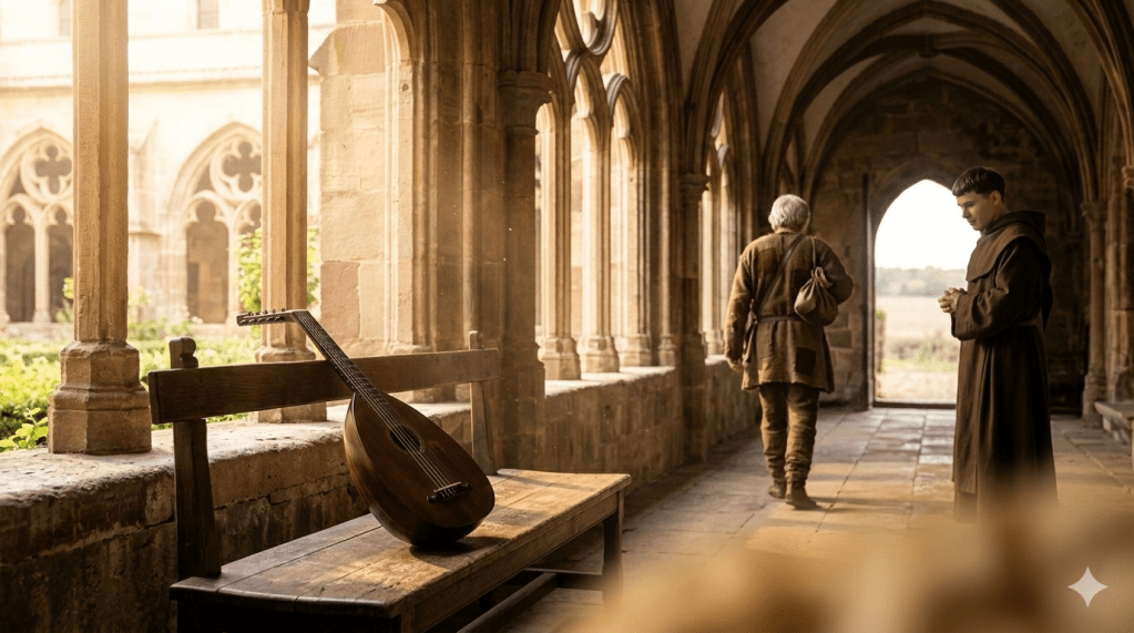 En «El Laúd de Estrasburgo», la primavera ha consolidado su victoria sobre el invierno de la peste. Bajo una claridad dorada que calienta las piedras del monasterio, Guillem toma una decisión que nace de la libertad más absoluta: es hora de partir. Con el cabello blanco y la paz conquistada en el servicio, el cantor deposita su instrumento sobre el banco de madera del hospital.